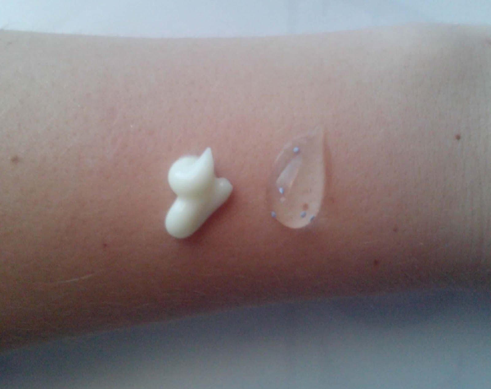 Konzistenciu majú rozdielnu. Naľavo je anticelulitídné sérum, ktoré má krémovú konzistenciu a napravo spevňujúca emulzia s gélovou konzistenciou. Anticelutitídne sérum mám už dlhšiu dobu, no musím povedať, že ho odkladám na jeseň a v lete budem používať Spevňujúcu emulziu. Dôvod? Obsahuje malé modré čiastočky, ktoré sa na pokožke rozpustia a príjemne chladia. Navyše gélové zloženie sa rýchlejšie vstrebe do pokožky.